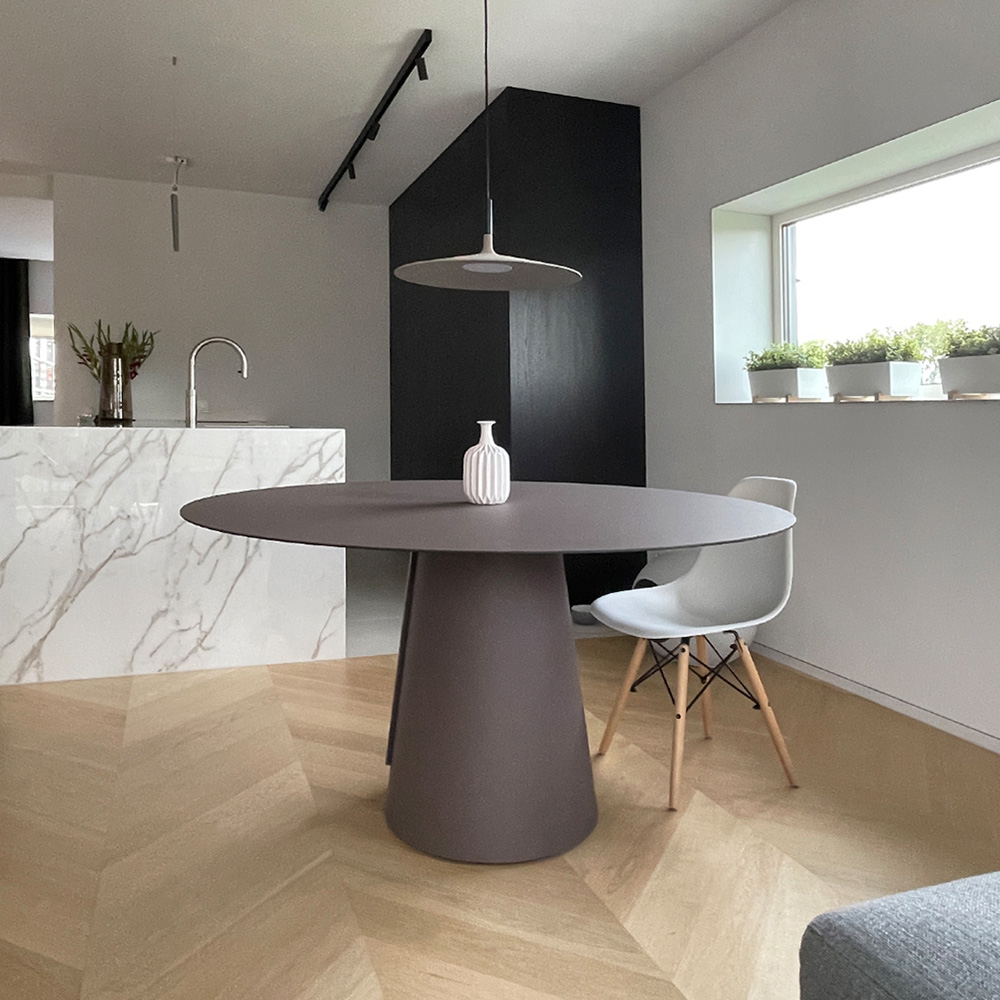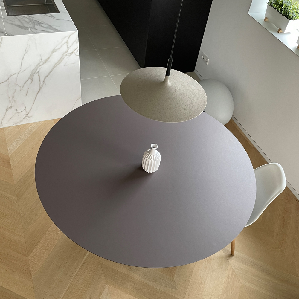Zowel het blad als de voet van de Dine eettafel zijn uitgevoerd in linoleum. Naast de speelse ‘wikkel’ maakt dat deze tafel uniek. Het is alsof het linoleum vers van de rol komt. Linoleum is een milieuvriendelijk materiaal dat uitsluitend is opgebouwd uit natuurlijke grondstoffen. Dit maakt deze ronde eettafel helemaal van nu.